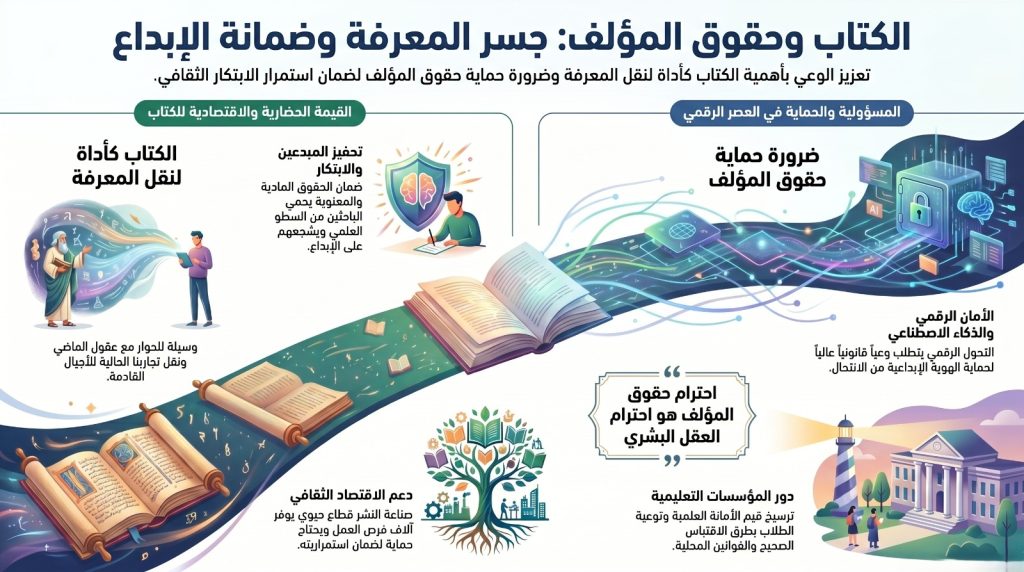 إن توفير المصادر العلمية الحديثة، سواء الورقية منها أو الرقمية، يفرض علينا مسؤولية أخلاقية وقانونية جسيمة. فالمكتبة هي المحطة الأولى التي يتعلم فيها الباحث أن “الحق في المعرفة” يقابله “الالتزام بالاحترام”؛ احترام الجهد الفكري والبحثي الذي بذله الآخرون. ومن هنا، تنبثق أهمية حماية حق المؤلف كضمانة تمنح الكاتب الثقة في إيداع نتاجه الفكري بين رفوفنا.
